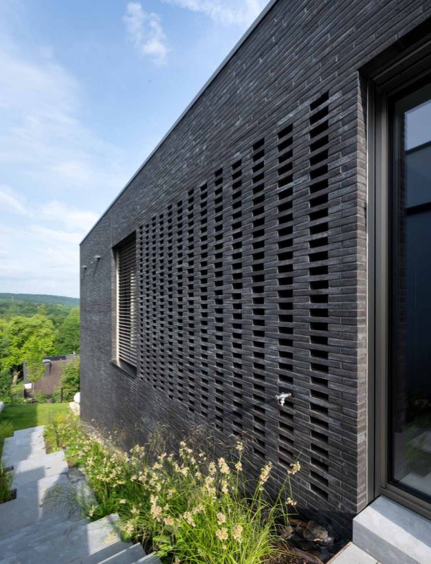 Despite the dark color, the façade feels light, thanks to the layered effect of the brick bands and large glass surfaces that break up the heaviness of the stone. On the garden side, carefully placed openings – such as a recessed loggia and pool area – add depth and connection between inside and outside.